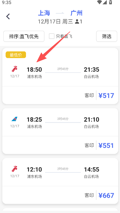 3、航班信息展示清晰,含起降时间、时长等内容,便于快速了解航班的核心信息。