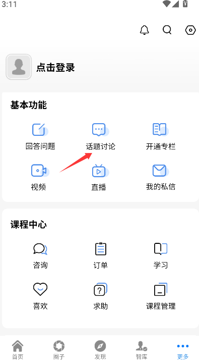 2、在功能列表中选择"话题讨论"选项,进入社区话题广场界面。
