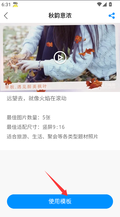 2、在模板展示页面中选定所需模板后点击使用,进入照片导入与编辑界面。