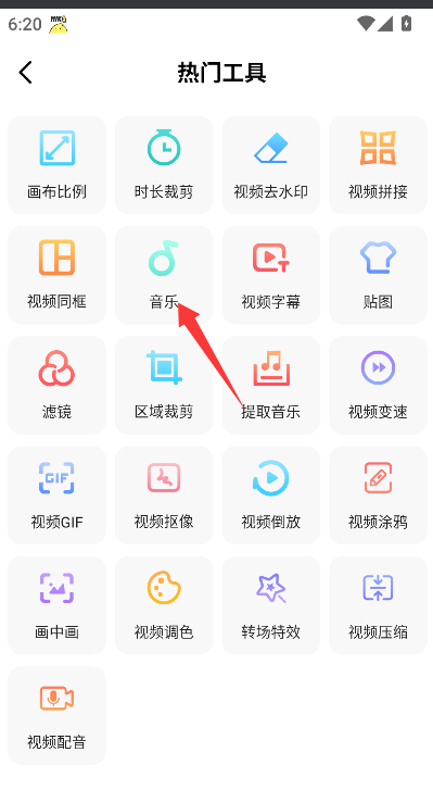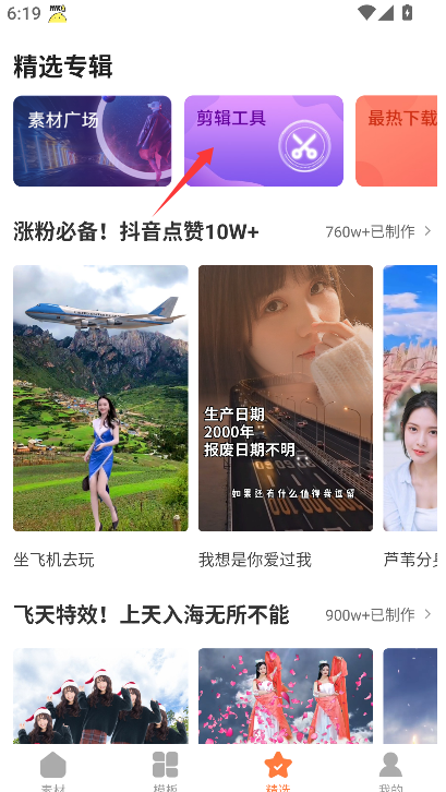 1、在首页的精选页面中找到并点击"剪辑工具"入口,进入热门工具选择界面。