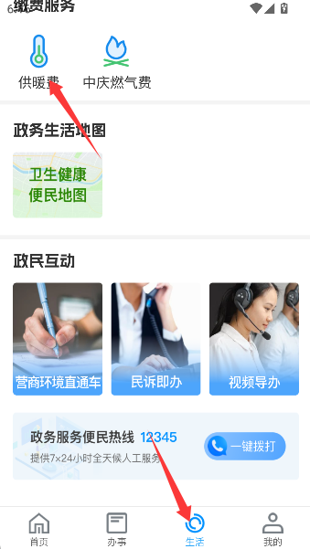 1、在首页底部找到"生活"这个温暖港湾,轻轻点入,在服务列表里精准锁定"供暖费"选项。