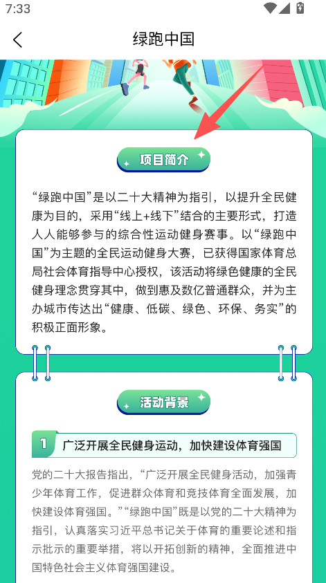 1、提供赛事板块查看功能,进入绿跑中国板块,查看赛事的项目简介及活动背景内容。