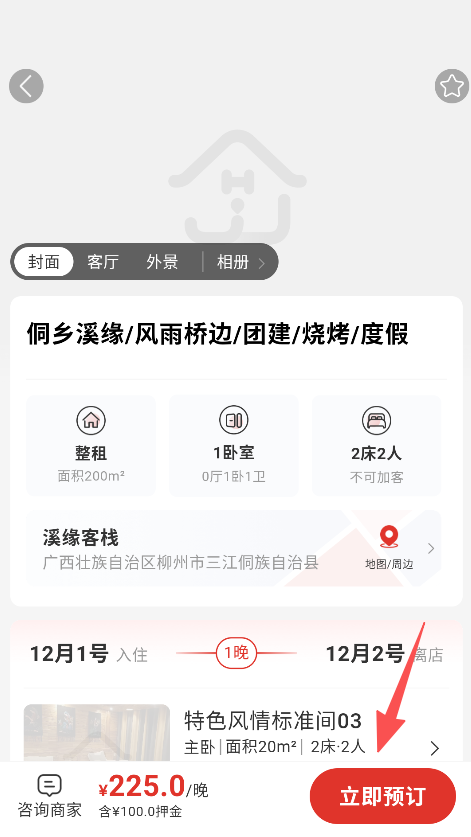 3、在民宿详情页选择房型,点击立即预订完成民宿的预订操作。