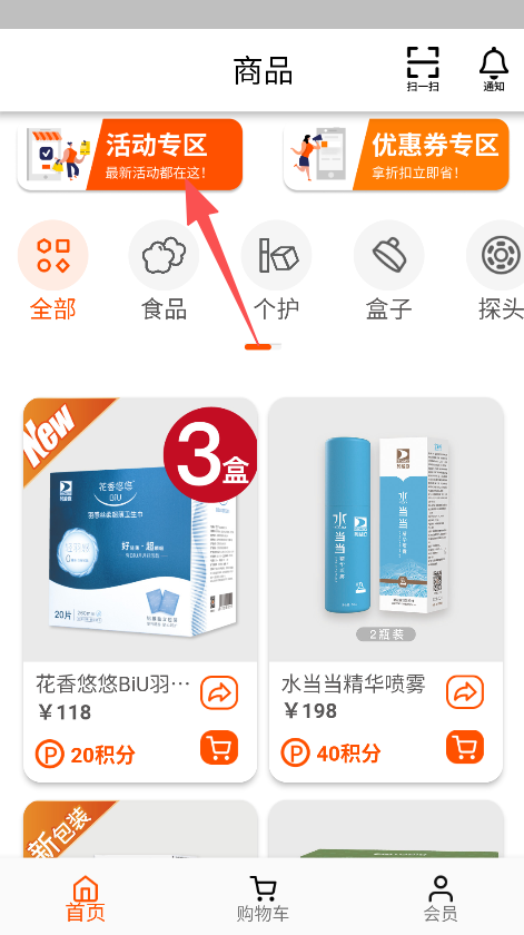 1、打开碧波庭购进入首页,选择活动专区查看商品。