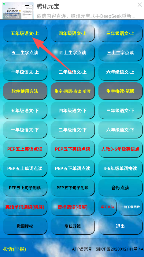 1、提供年级科目选择功能,打开软件后选定五年级语文上,进入对应科目的学习板块。