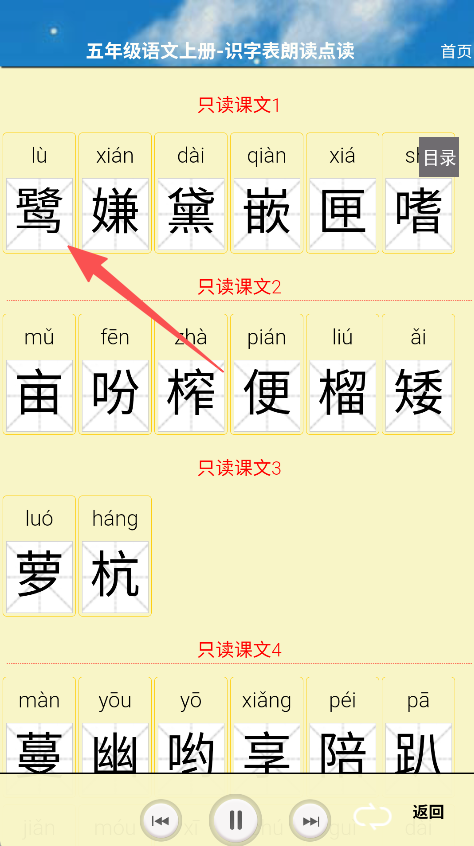 2、提供课文分课选择功能,通过导航板块选定目标课文,配合字词点读,提升语文学习的针对性。