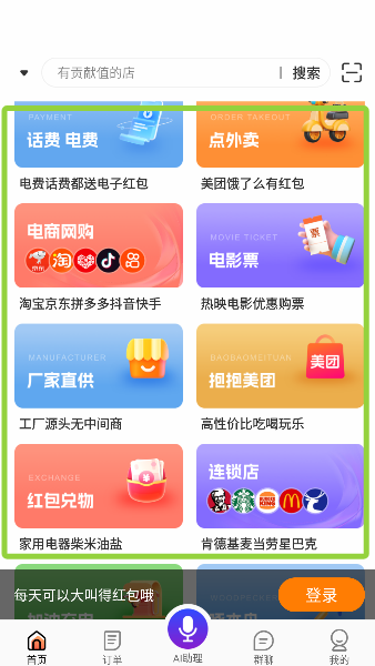 2、中间板块集结了吃货和购物狂的快乐源泉,点外卖、买电影票一键直达,堪称懒人生活的指挥总部。