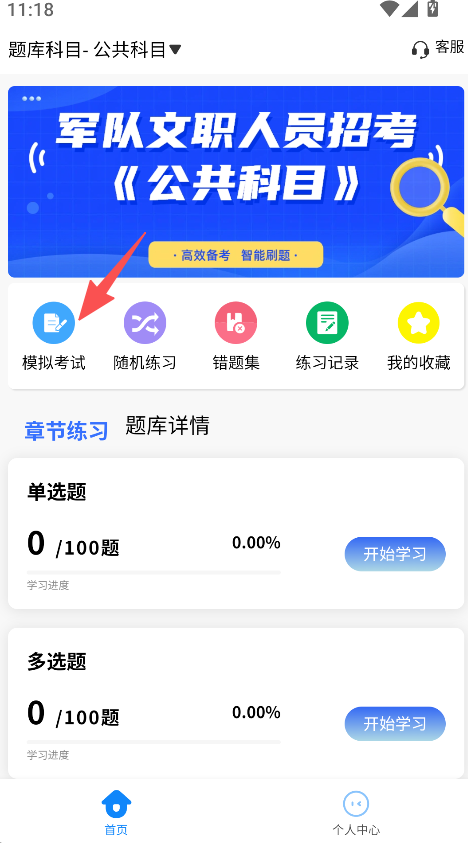 2、进入题库页面后、选择模拟考试功能、进入模拟试卷答题页面。