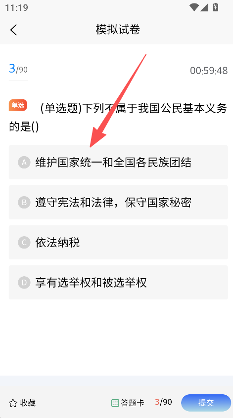 3、在模拟试卷页面、完成题目选项选择、推进答题进程。
