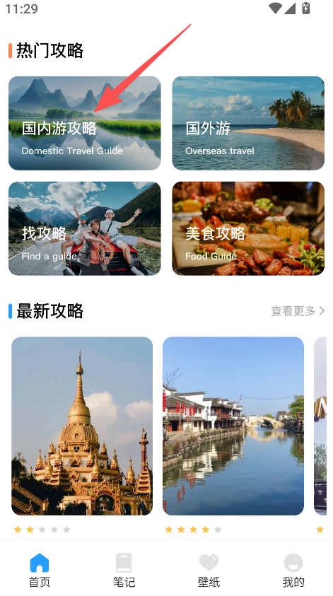 1、打开软件后、进入首页热门攻略板块、选择国内游攻略。