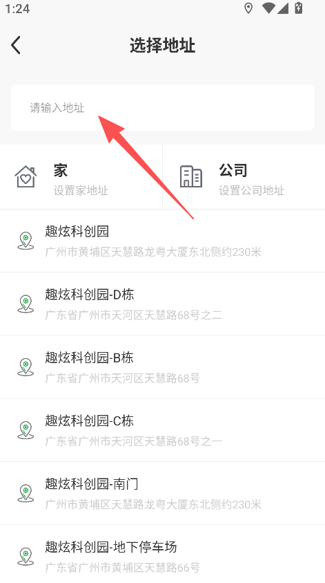 2、提供地址选择功能,可输入地址或选择常用地址(家、公司),细化上车地点的设置环节。