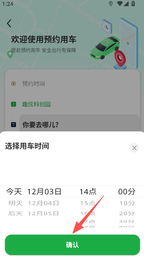 3、进入选择用车时间页面、选定时间后、点击确认完成预约。