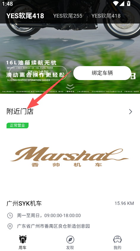 1、提供附近门店查询功能,进入对应板块,查看营业中的机车门店列表。