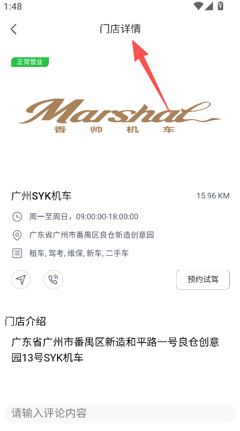 2、门店详情涵盖多维度内容,含营业时间地址及租车驾考等业务,丰富门店服务的了解维度。