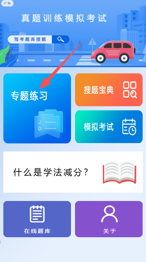 1、提供专题练习功能,进入对应页面,选择多选单选等练习类型,开展学法减分的专项练习。