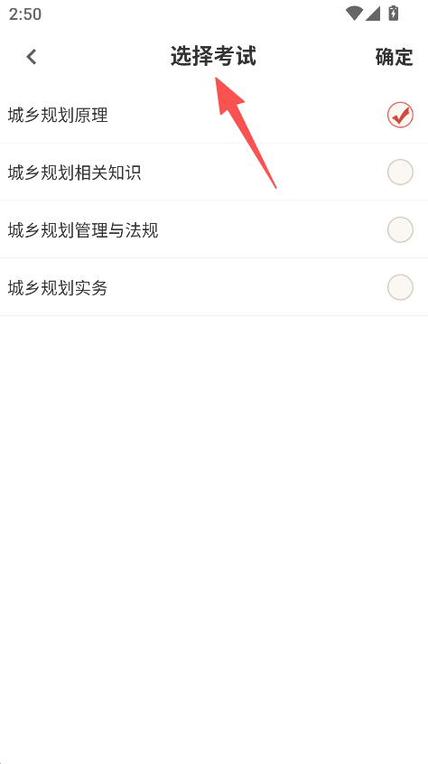 1、提供考试科目选择功能,进入选择考试页面,挑选城乡规划原理等科目并确定,进入对应考试的题库页面。