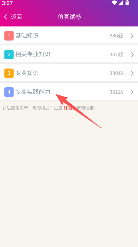 2、支持试卷类别选择功能,在仿真试卷页面选择专业实践能力等类别,进入对应试卷的模式选择页面。