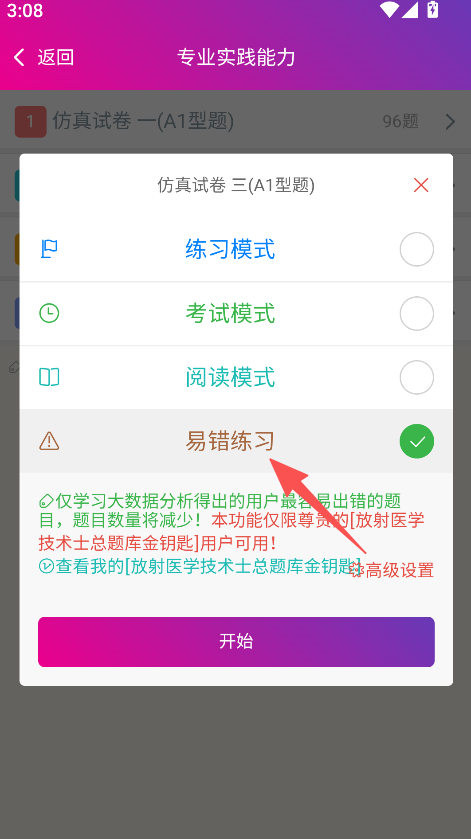 3、具备模式选择及练习功能,选择易错练习等模式后点击开始,进入对应练习页面开展刷题操作。
