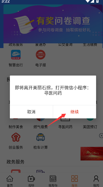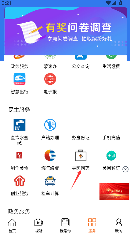 2、在服务分类列表中,选择"寻医问药"医疗健康服务板块。