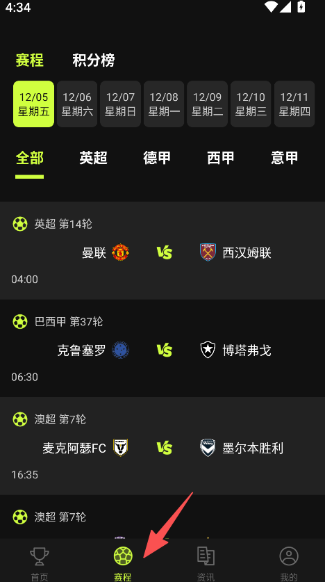 1、打开软件后、进入赛程板块、浏览不同日期及联赛的赛事内容。