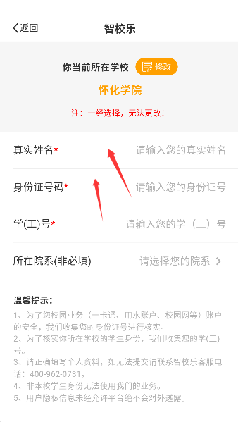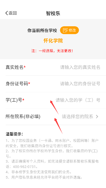 3、再准确输入学号或工号并选好院系,就像领到了一张专属的校园电子通行证。