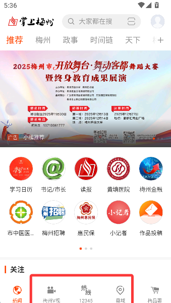 3、滚动至首页底部的“梅州V视”和“县城板块”,则像打开一扇视听窗口和一张宝藏地图,带你直观感受本土风情并深入探索各县特色。
