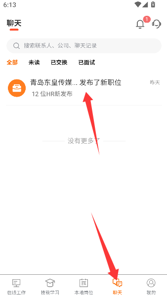 1、点击首页底部的聊天图标,就像走进一个热闹的招聘会现场,新鲜发布的职位清单立刻跃然眼前。