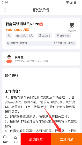 3、轻触立即沟通按钮,瞬间与招聘方建立直达通道,像是对着职场机会轻轻敲响了第一声门铃。