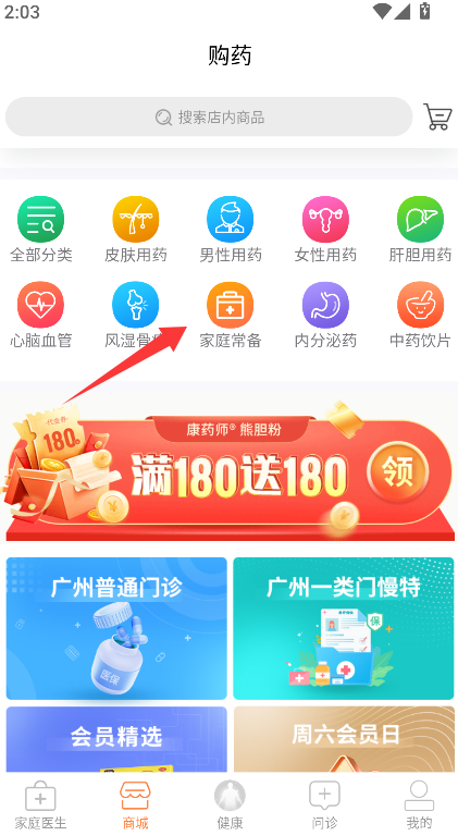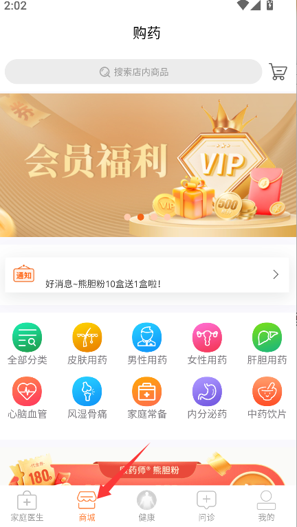 1、找到并点击导航菜单或功能图标区的“商城”入口,页面将跳转至在线药品商品列表页面。