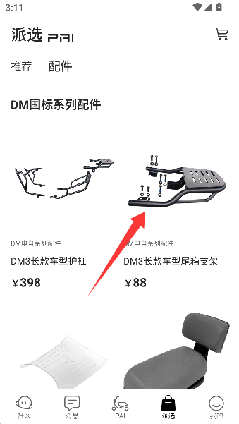 2、接着戳进“配件”乐园,琳琅满目的车筐、头盔仿佛在说“选我选我”,一场指尖购物狂欢就此开幕。