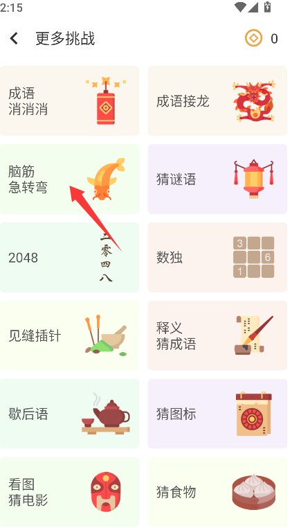 2、浏览各种活动分类,定位并选择"脑筋急转弯"选项,进入该益智游戏模块。