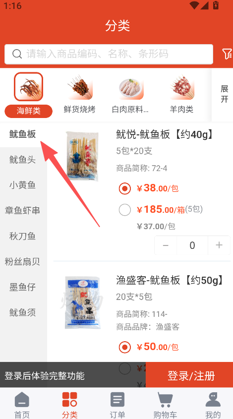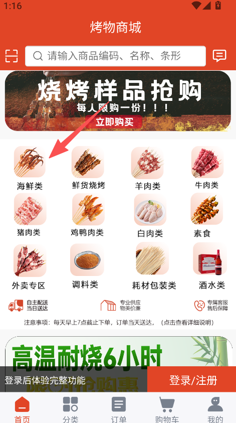 1、具备分类选品功能,在分类页选择海鲜类等类别,获取对应类型的烧烤食材商品信息。