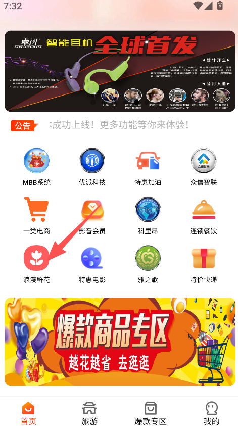 1、聚焦生活消费场景,设浪漫鲜花等多类功能入口,含爆款商品专区,适配日常消费选购的需求。