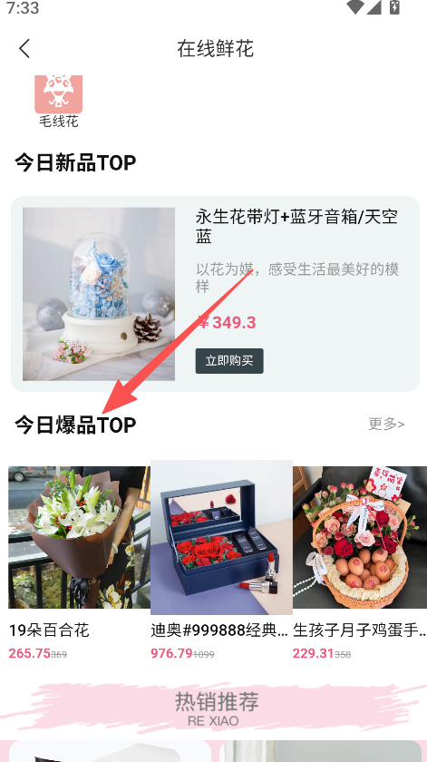 2、鲜花板块划分新品、爆品分类,展示商品价格及销量,细化消费选择的参考维度。