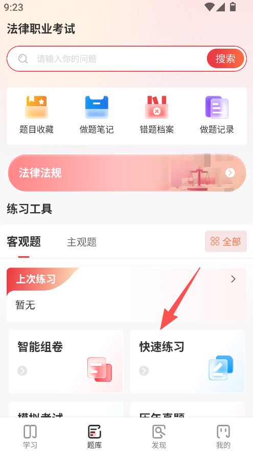 1、打开进入题库板块,点击快速练习。