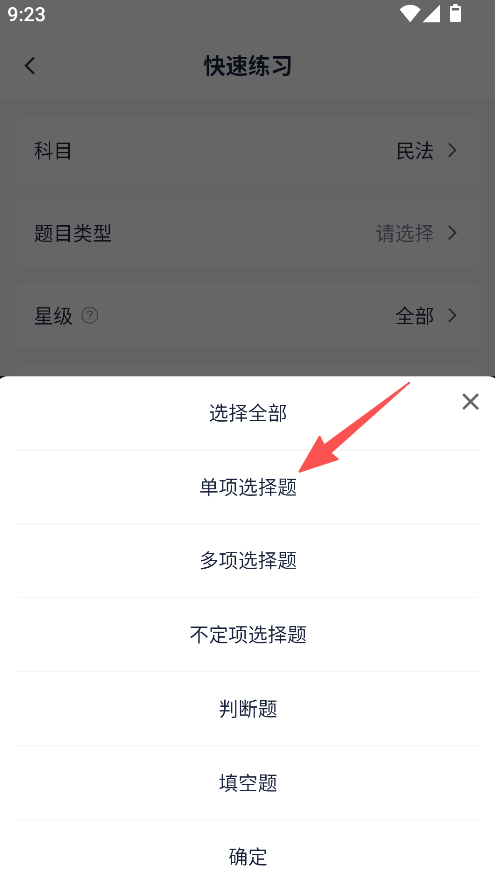 2、在快速练习页面选择科目,再选定题目类型。