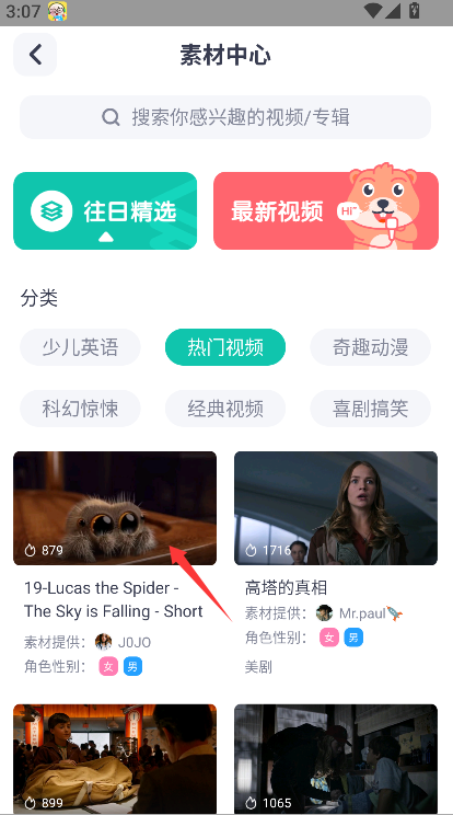 1、找到并点击“配音素材”入口,页面将跳转至包含海量视频片段的素材中心。