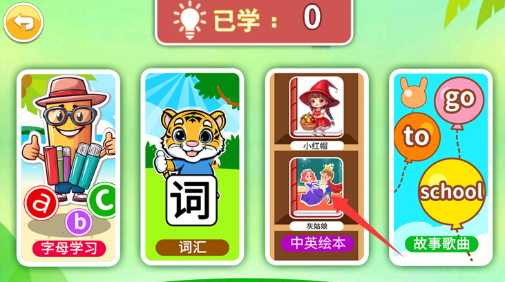 2、界面会展示多个不同主题的学习板块,例如字母、单词、儿歌等,根据学习需求点选其中一个板块进入。