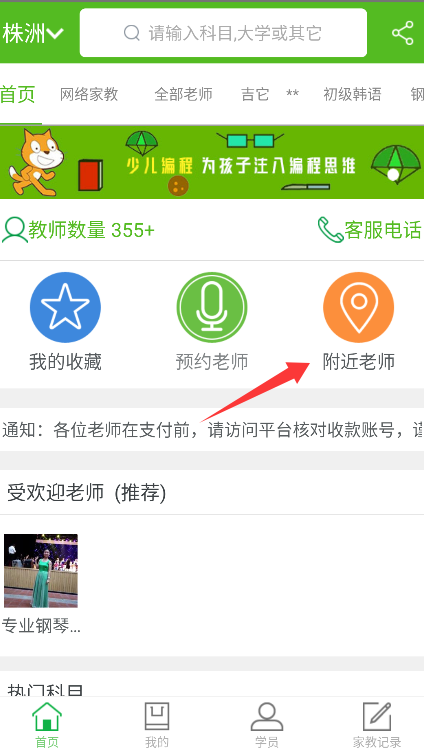1、在应用主页找到并点击“附近的老师”功能入口,系统将自动基于当前地理位置进行检索。