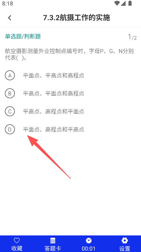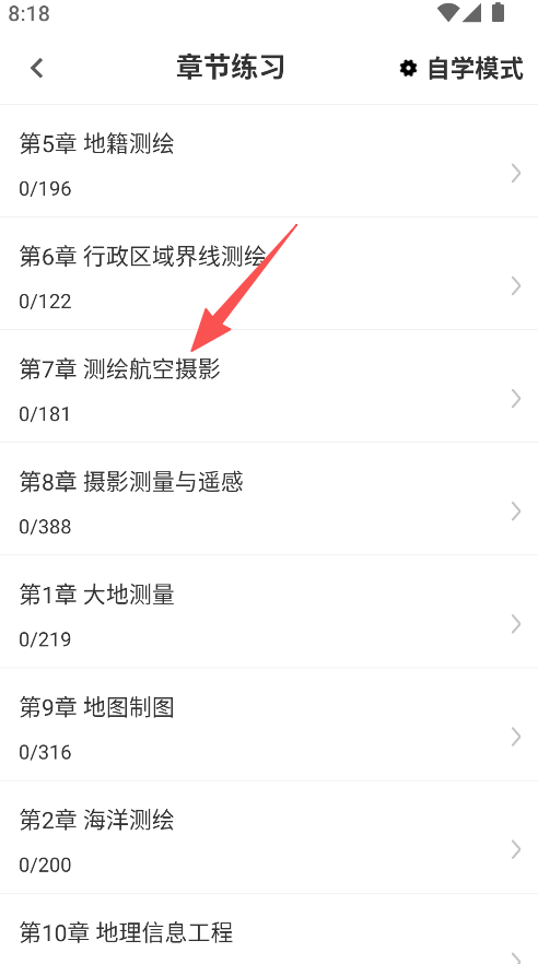 1、提供章节练习功能,点击对应选项,进入页面选择地籍测绘、航空摄影等目标章节。