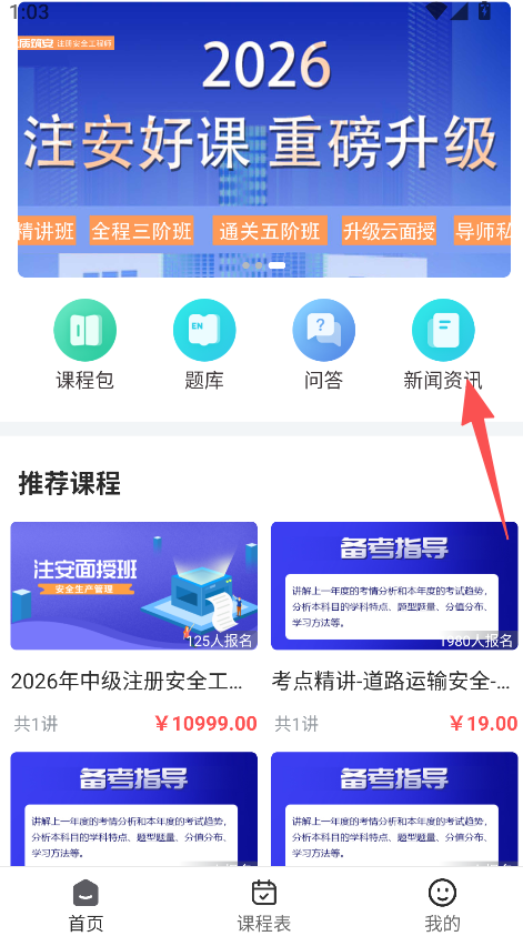 1、打开软件进入首页,浏览推荐课程或新闻资讯板块。
