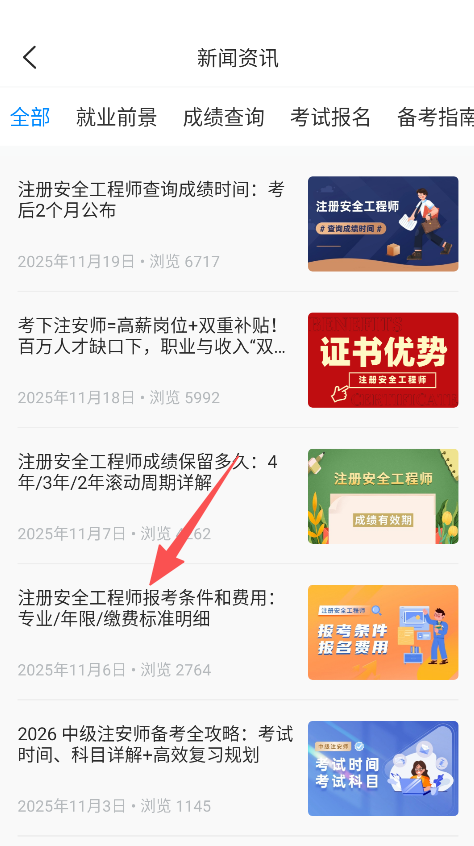 2、点击新闻资讯,选择对应分类查看注安相关资讯内容。
