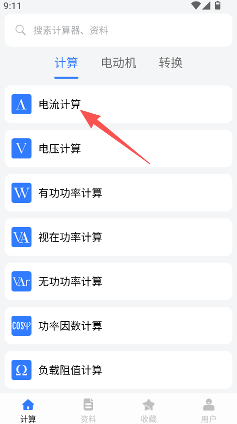 1、提供多类电工计算功能选择,进入计算板块,可选择电流电压功率等对应计算类型。