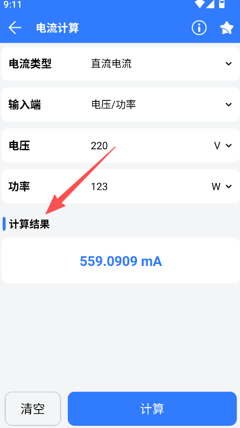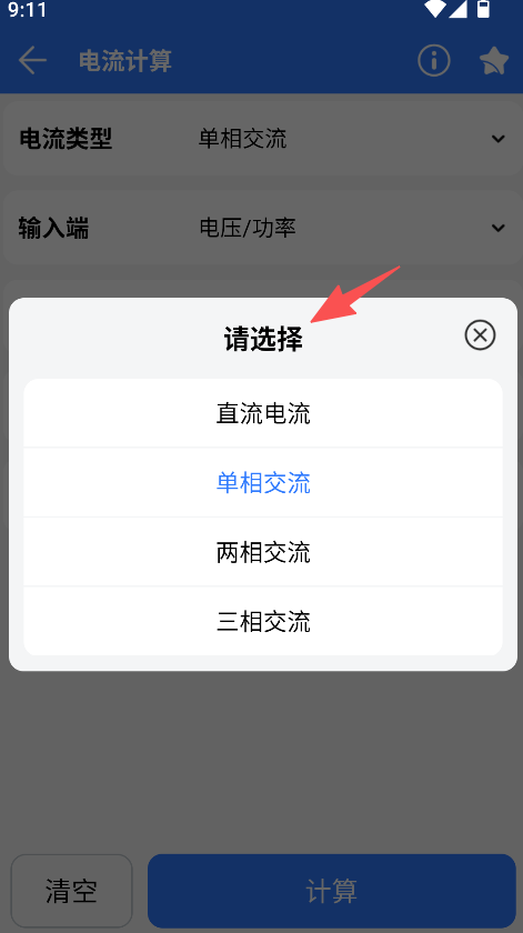 2、在电流计算页面,选定电流类型并输入对应参数。