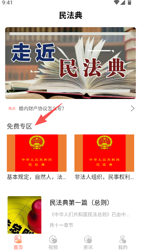 1、设首页、视频等板块,首页含免费专区,提供民法典相关课程,覆盖民法典学习的核心内容。