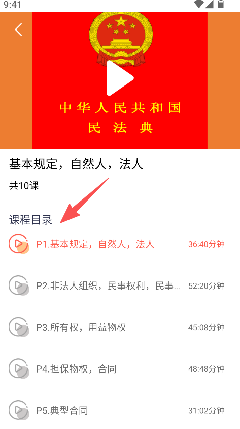 2、课程配备详细目录,每课对应不同民法典内容,助力系统开展民法典的学习。