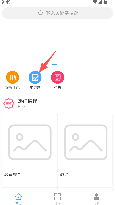 1、设课程中心、练习题、公告等板块,练习题含考试相关在线题库,覆盖考试备考的练习需求。