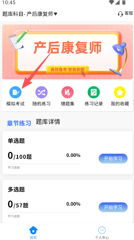 《医考考试学知题》是一款医考备考类题库软件,涵盖产后康复师等医考科目,设模拟考试、随机练习等功能,选择对应科目后进入模拟考试,点击开始答题即可刷题,功能覆盖医考备考的练习环节,满足医考人员的复习与备考需求。