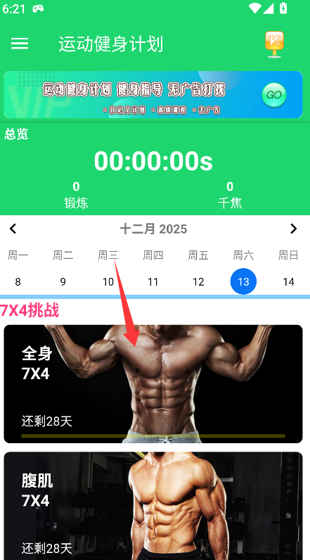 1、浏览并选定一个符合自身目标的健身计划卡片,点击进入该计划的详细内容介绍与周期安排界面。