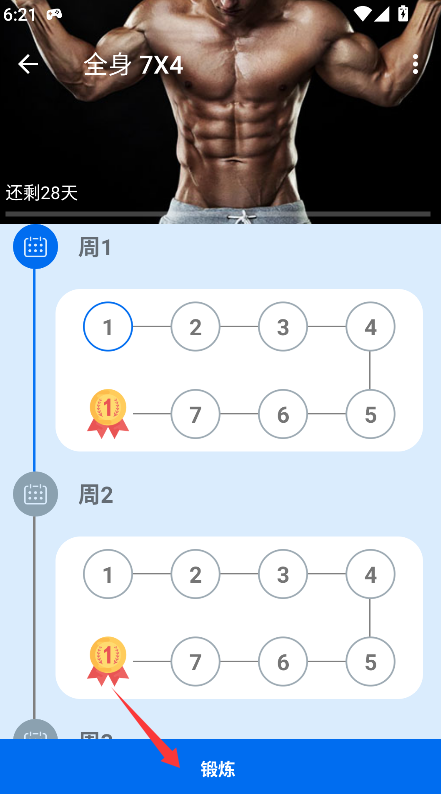 2、然后点击页面底部的“锻炼”按钮,进入当日的具体训练动作列表。